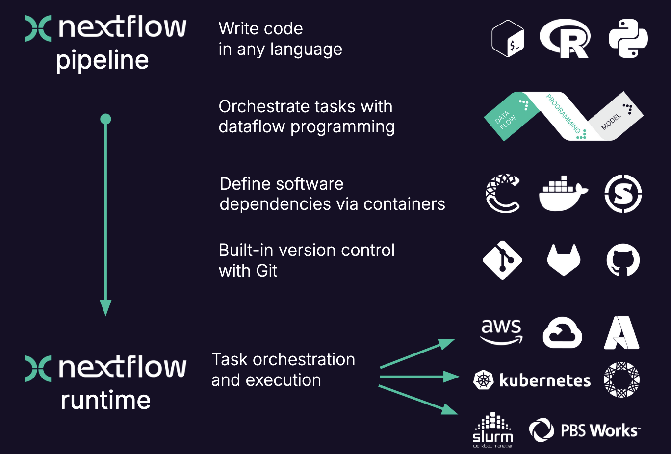 Workflow managers provide a framework for the creation, execution, and monitoring of pipeline. <…> They simplify pipeline development, optimize resource usage, handle software installation and versions, and run on different compute platforms, enabling workflow portability and sharing. Wratten et al. (2021) Nature Methods