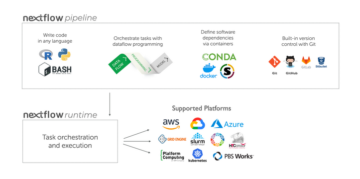 In other words, Nextflow provides an abstraction between the workflow’s functional logic and the underlying execution system (or runtime). Thus, it is possible to write a workflow that runs seamlessly on your computer, a cluster, or the cloud, without being modified. You simply define the target execution platform in the configuration file.