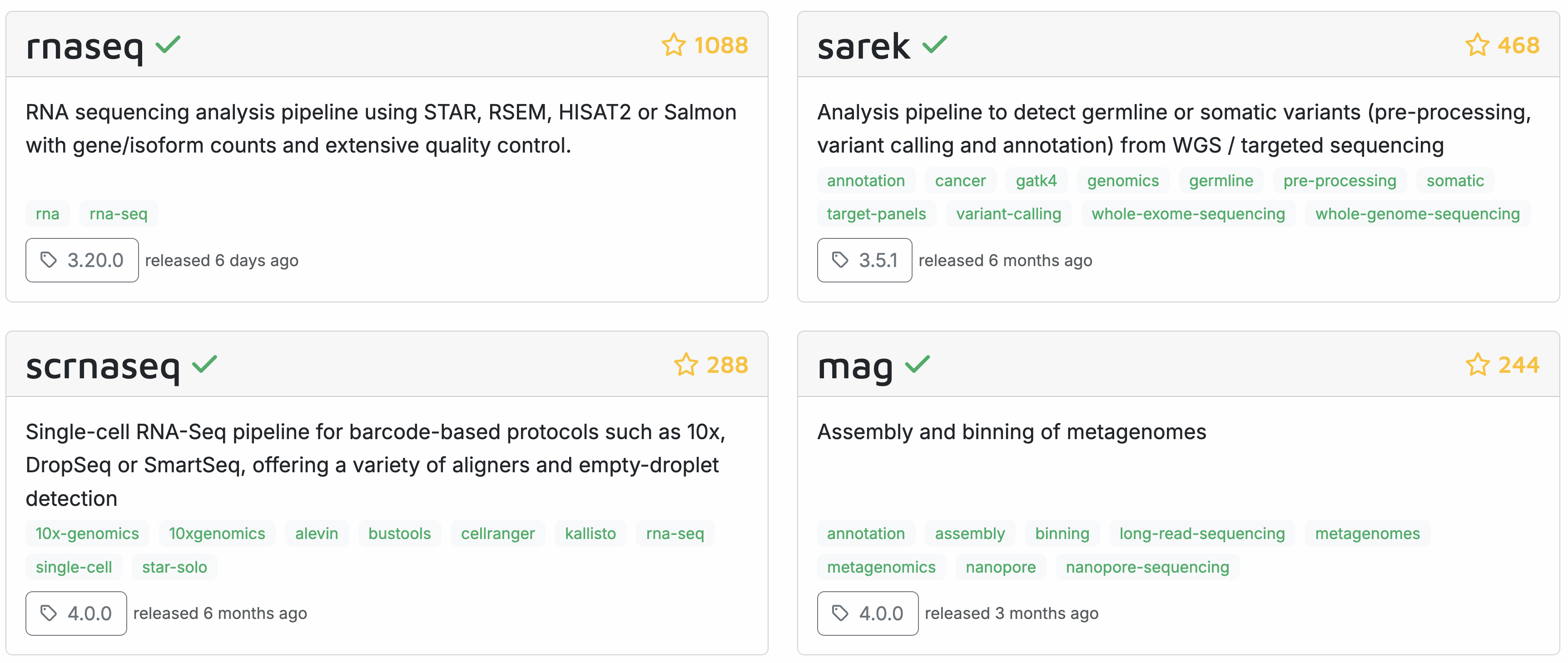 Nf-core provides already developed pipelines for many different data sets. Likely, a pipelines exists that you can use on your data. The documentation of the pipelines follows nf-core guidelines and is extensive and informative - it is easy to understand what the pipeline does and how it works. All output is explained in detail, with links to more extensive documentation.