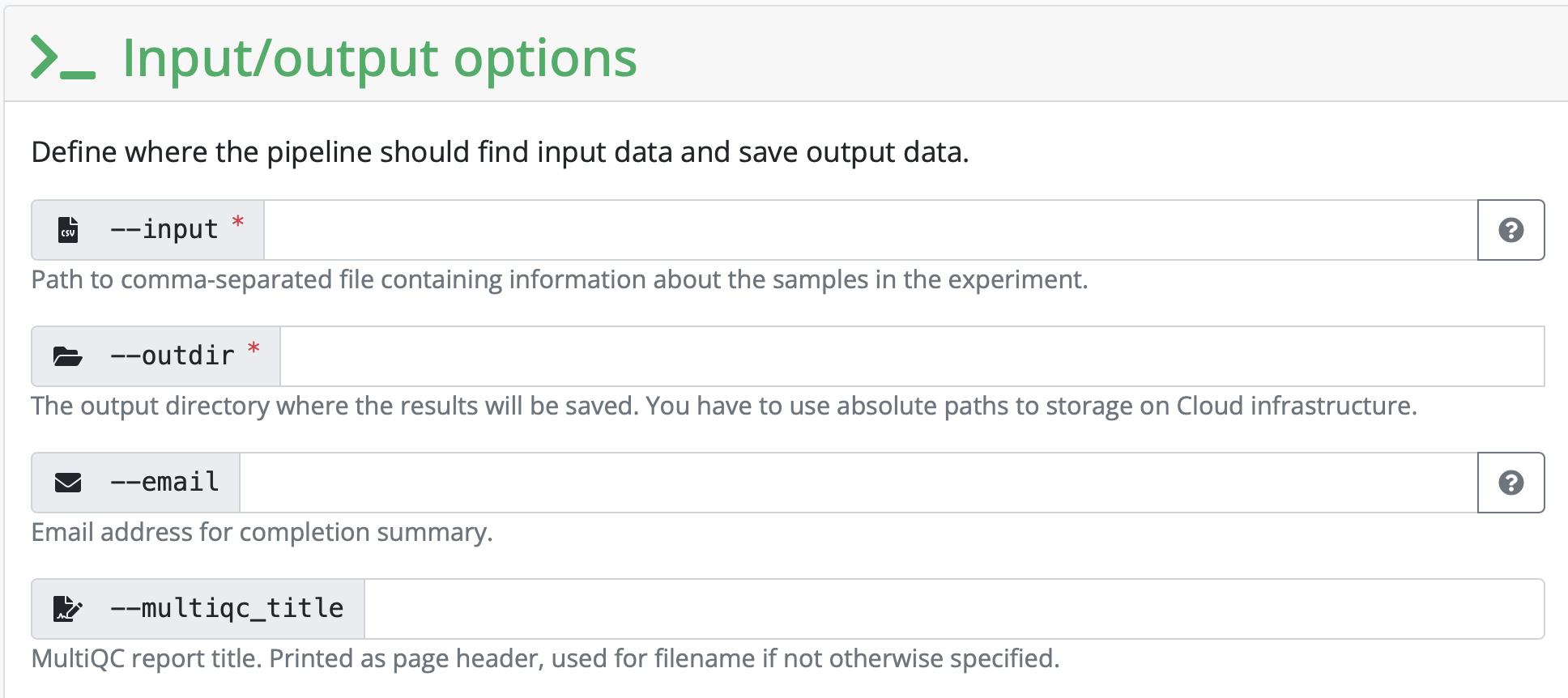 Next, the pipeline asks for the input CSV. Exact requirements for how that input file should look like can be found under the tab Usage