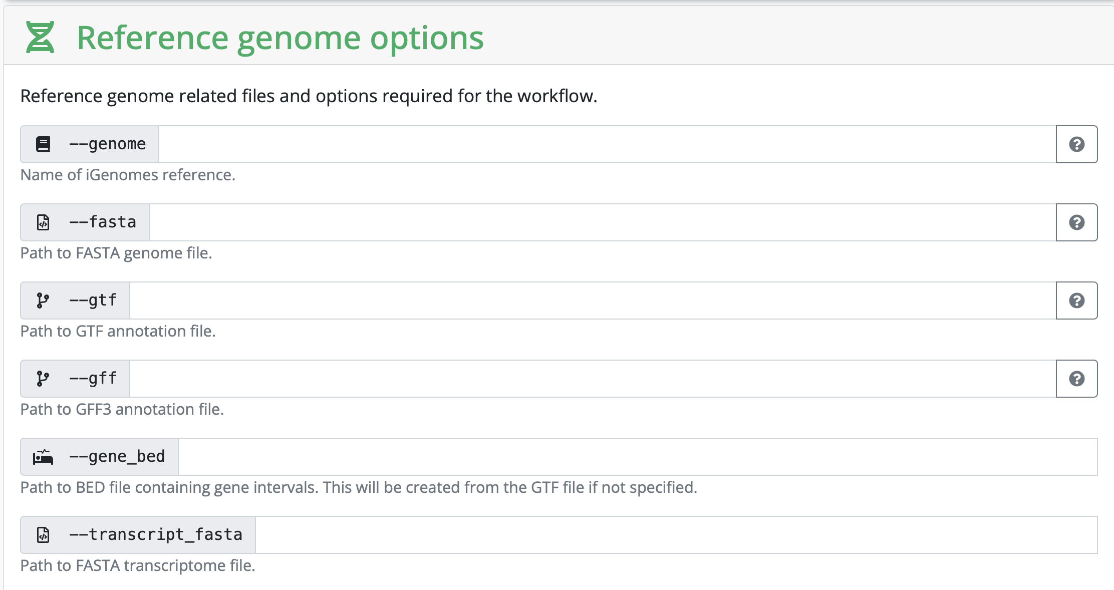 In this section, you set variables that are related to your reference genome. If you are using something listed on iGenomes, you can input that name. If you are working with your own reference genome, or something not listed, you need to input the absolute path of the reference genomes you have downloaded.